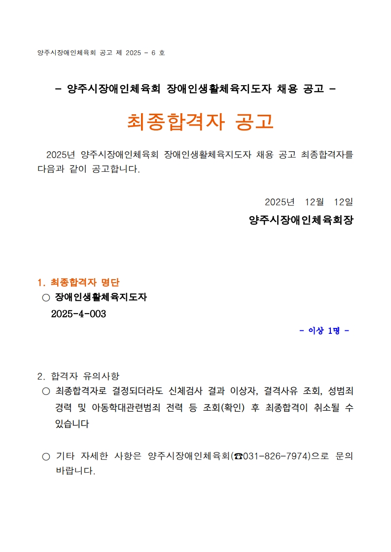 양주시장애인체육회 장애인생활체육지도자 채용 최종합격자 공고